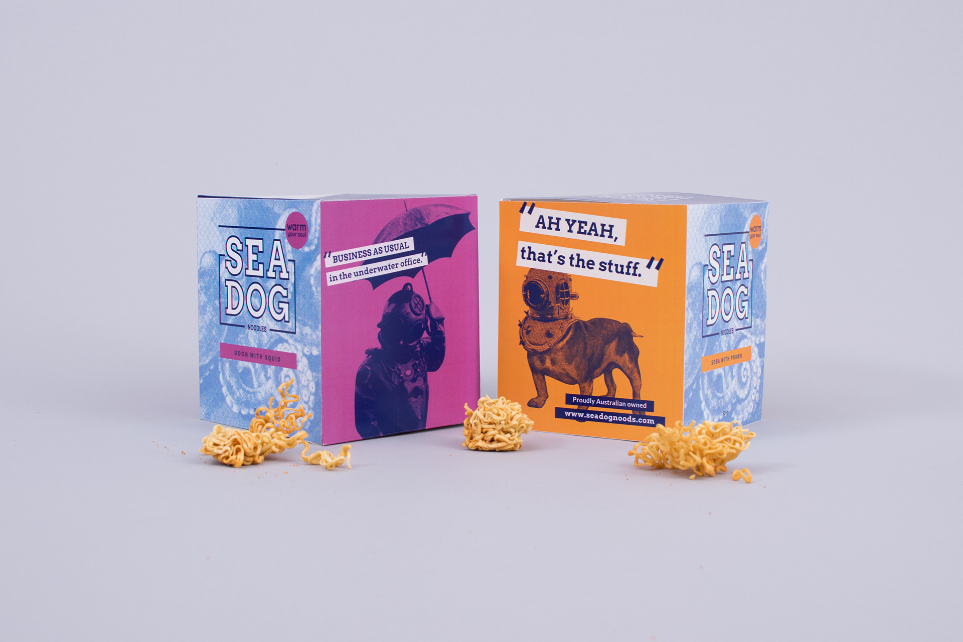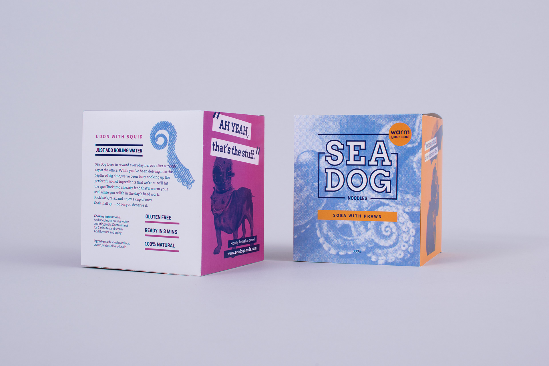 Quirky seafood noodle brand based around the idea of warming your soul after a rewarding day spent in the ocean